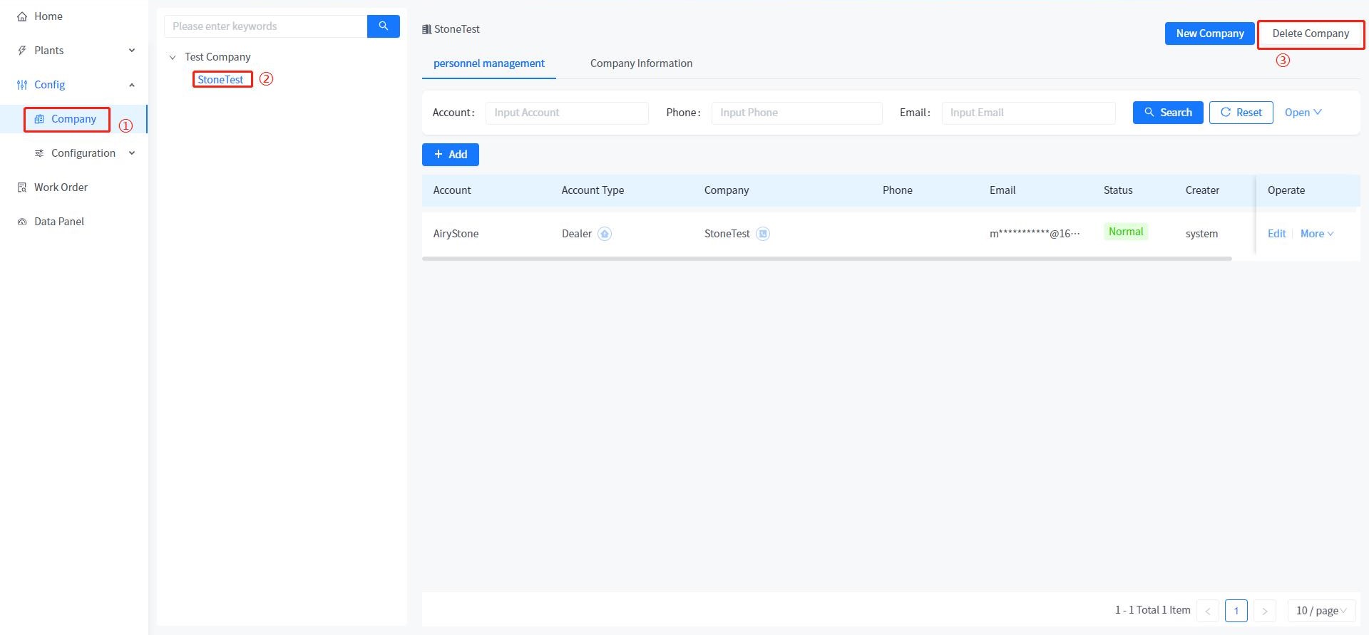 Delete the subordinate companies that belong to you in the system. When deleting a company, only companies without subordinate companies or personnel can be deleted. If there are personnel or company subordinates, they cannot be deleted.