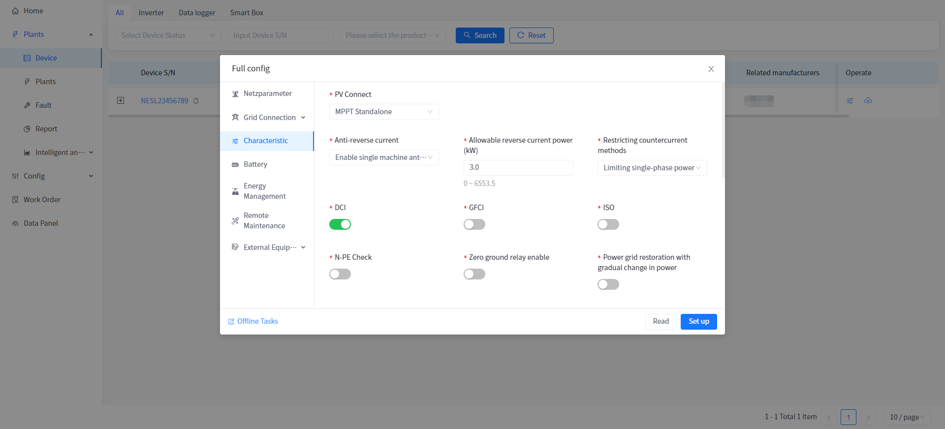| Power grid restoration with gradual change in power | Set the detection time for communication disconnection failure protection between the inverter and the data stick. | Open/Close |