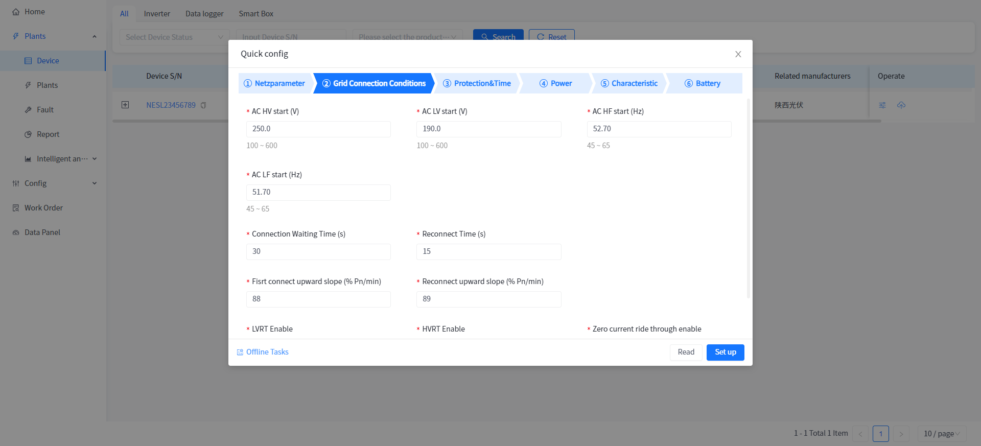 | LVRT Enable | Enable low voltage ride through function after activation | Open/Close |