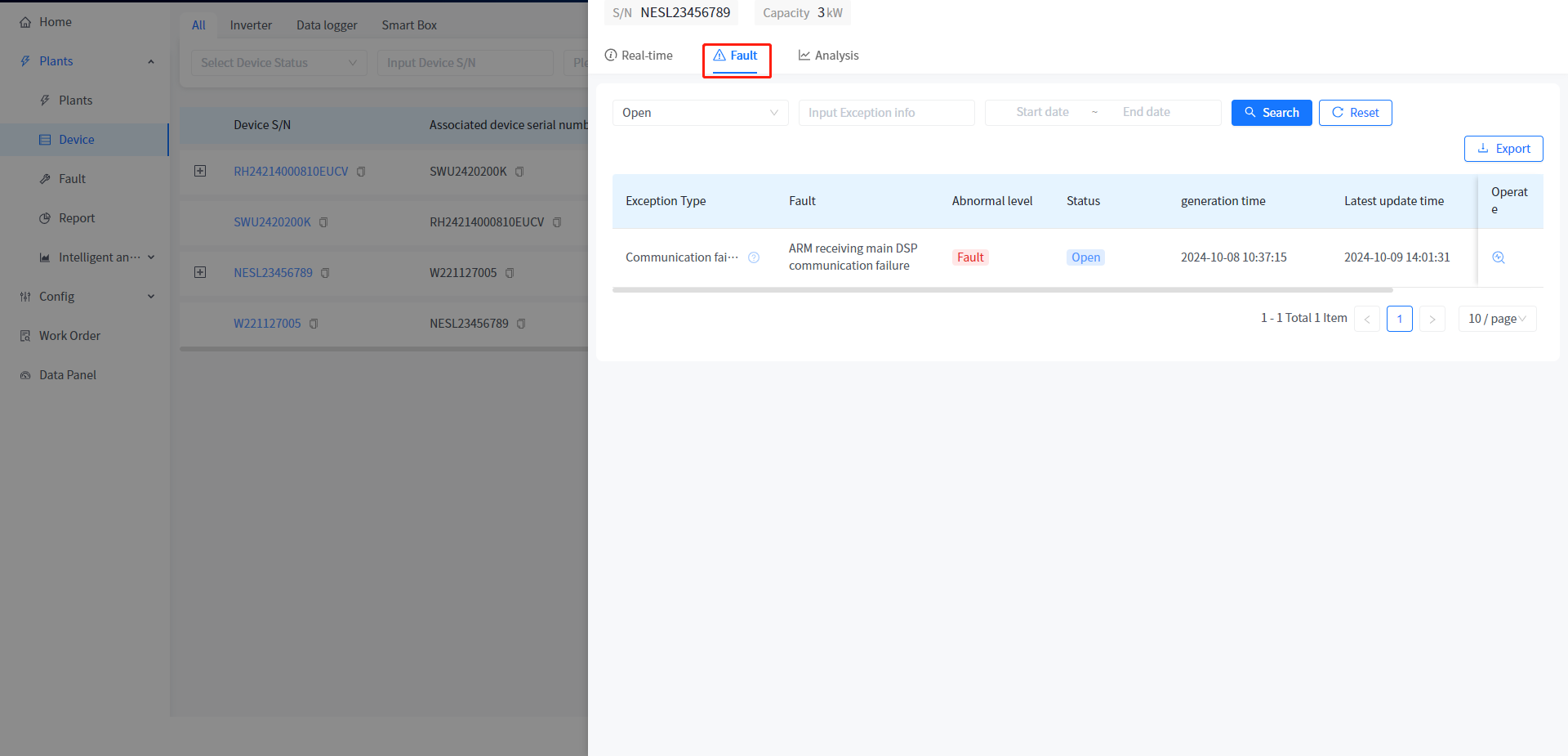 This system supports viewing real-time information data of devices within the Plant equipment management system; Support viewing fault details and identifying the cause of the fault within the device details; Support viewing statistical data of the device.