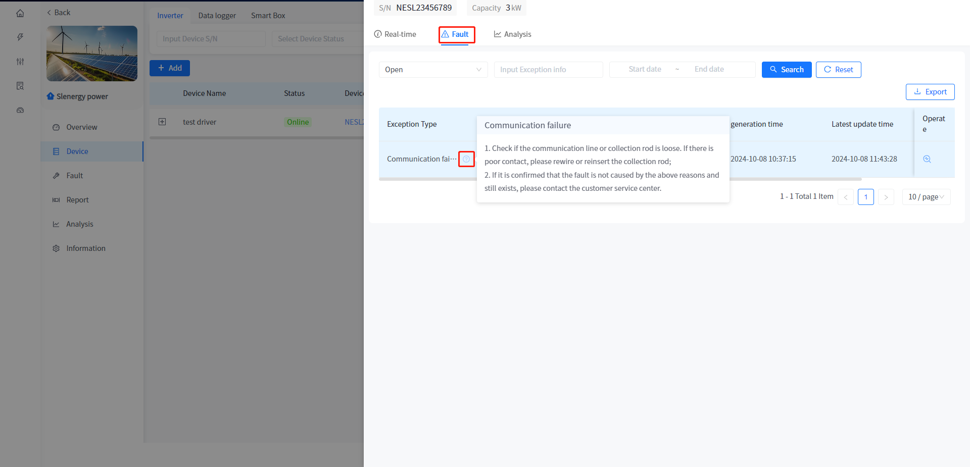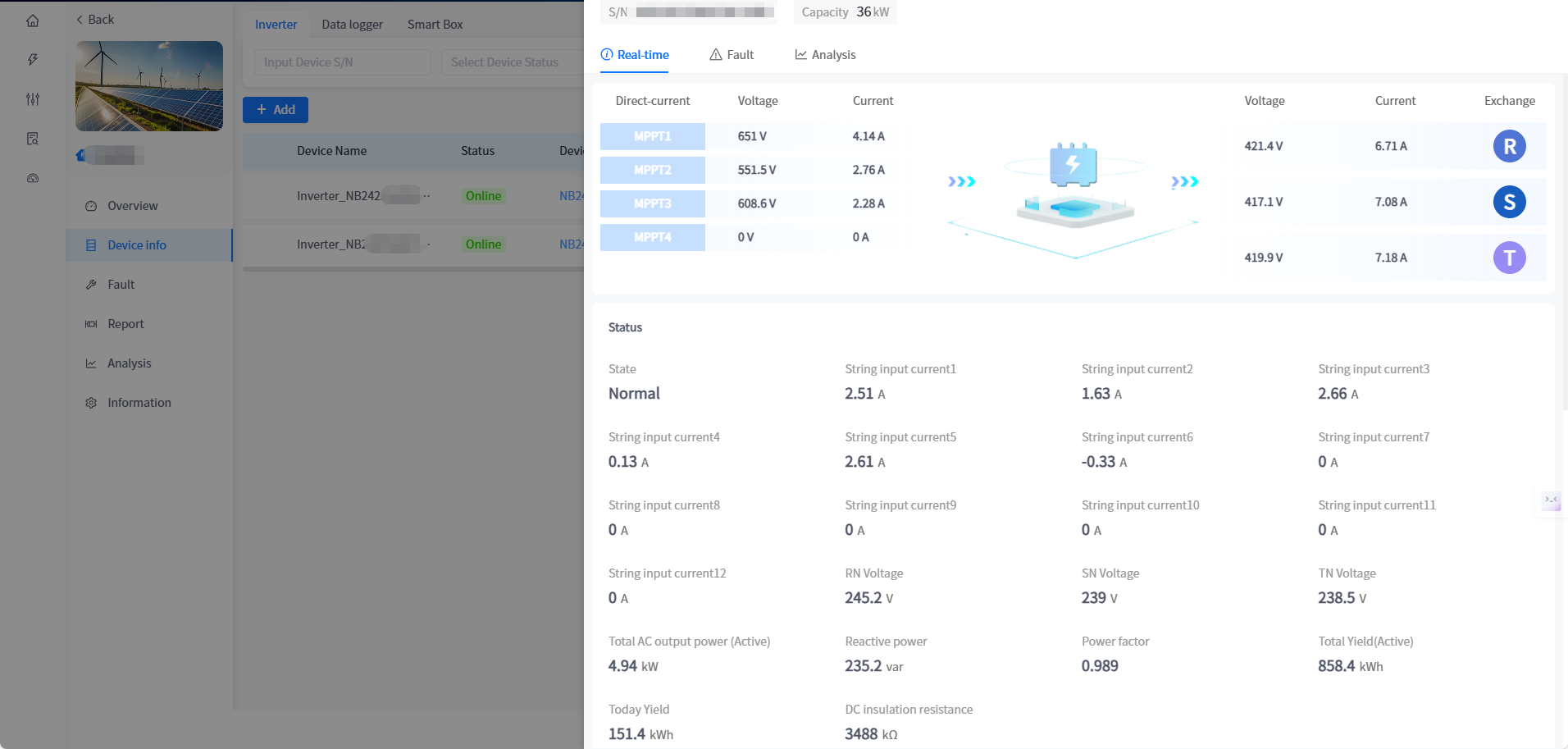 The system displays the detailed working data of the Device in the page of Device infor - real-time information, including: Device status, power generation data, network data, temperature, control and version details (updated once every five minutes).