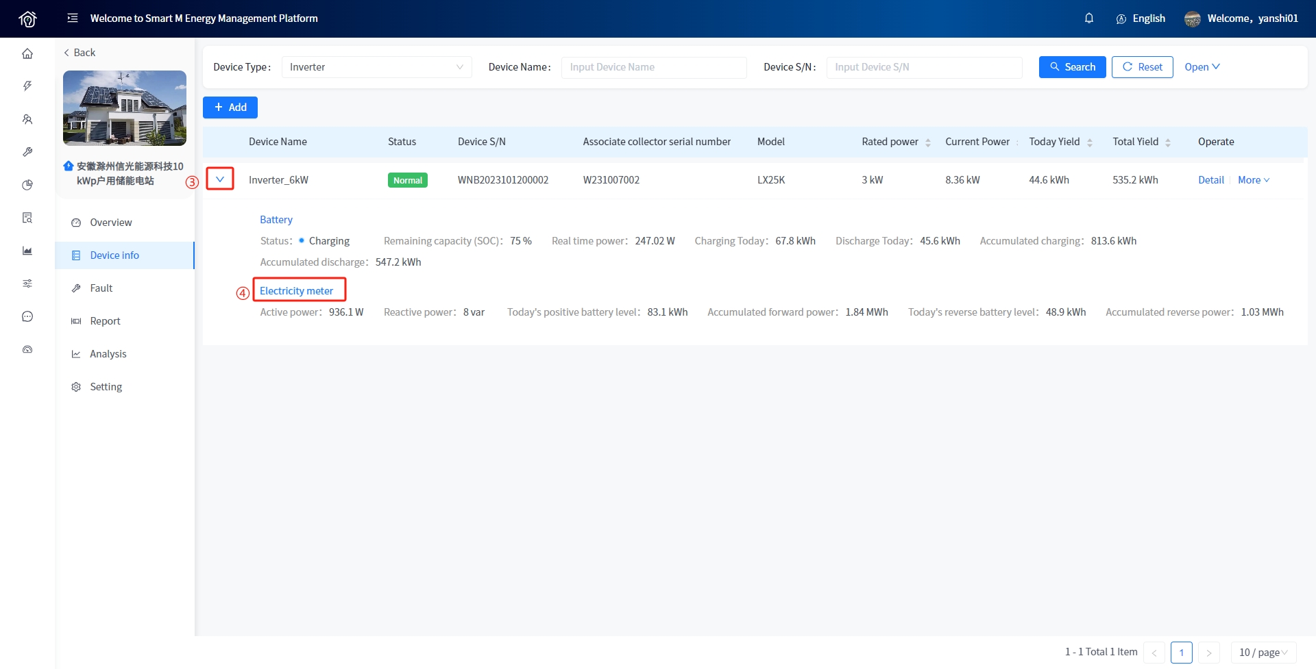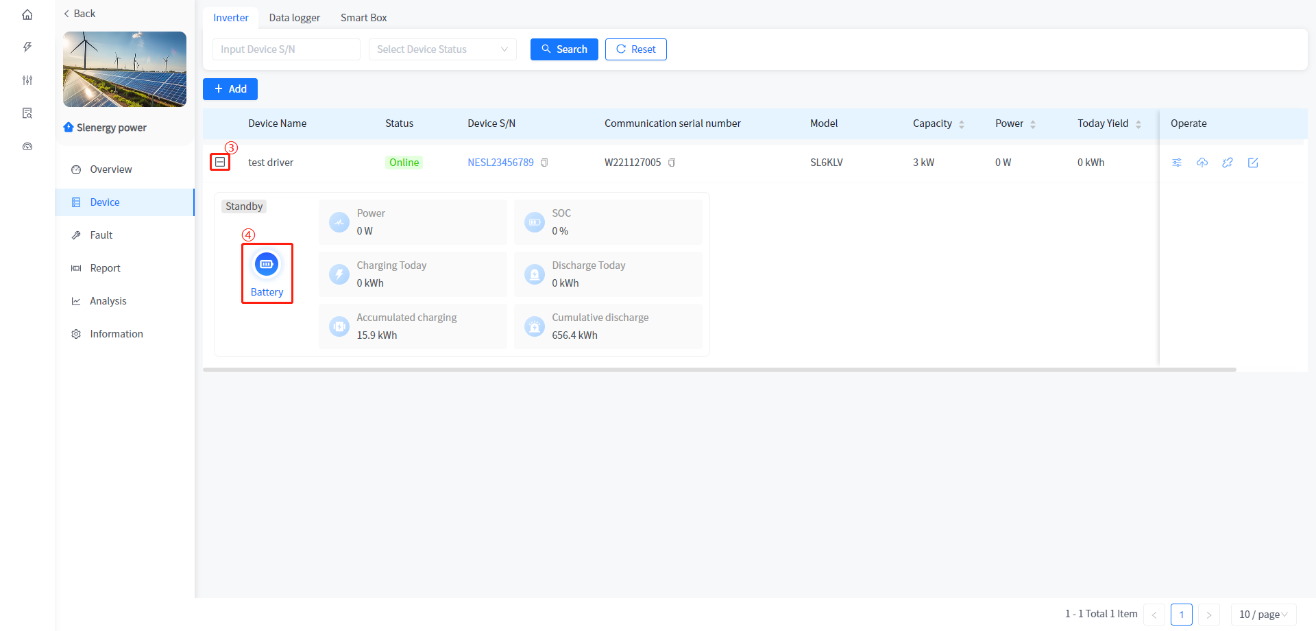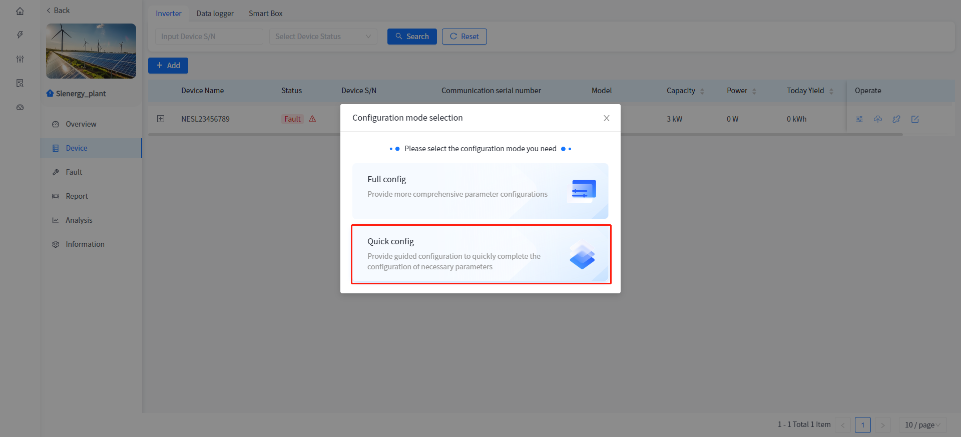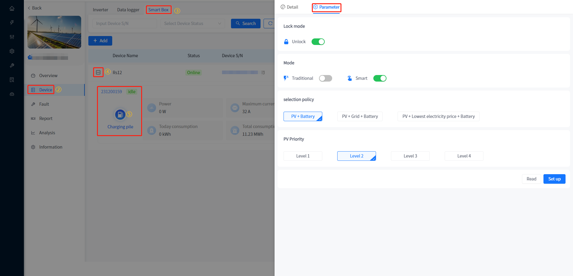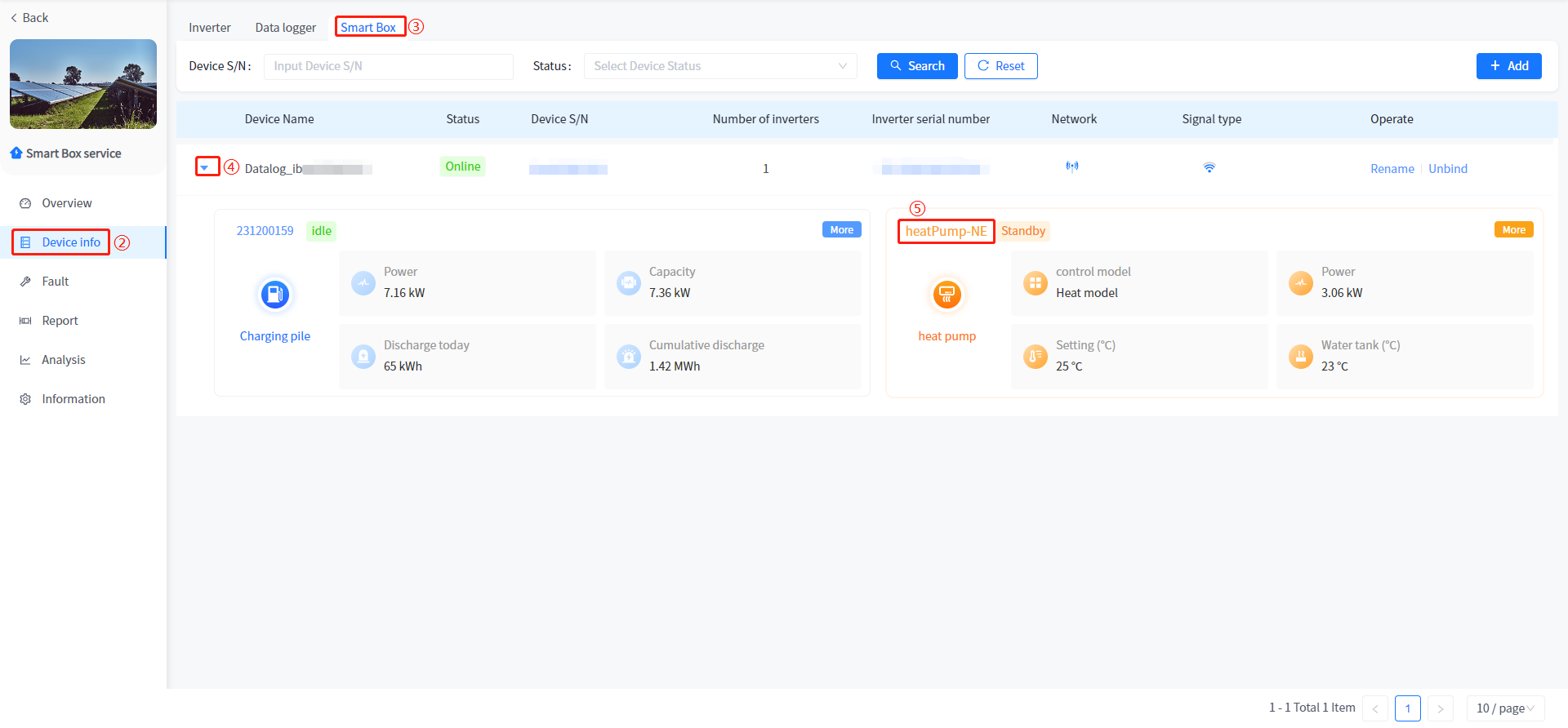 Add and associate Plants to Smart Box devices, as well as view data and configure parameters for associated heat pumps and charging stations under Smart Box. The addition of Smart Box devices is consistent with the addition of devices associated with the Plant, such as inverters.