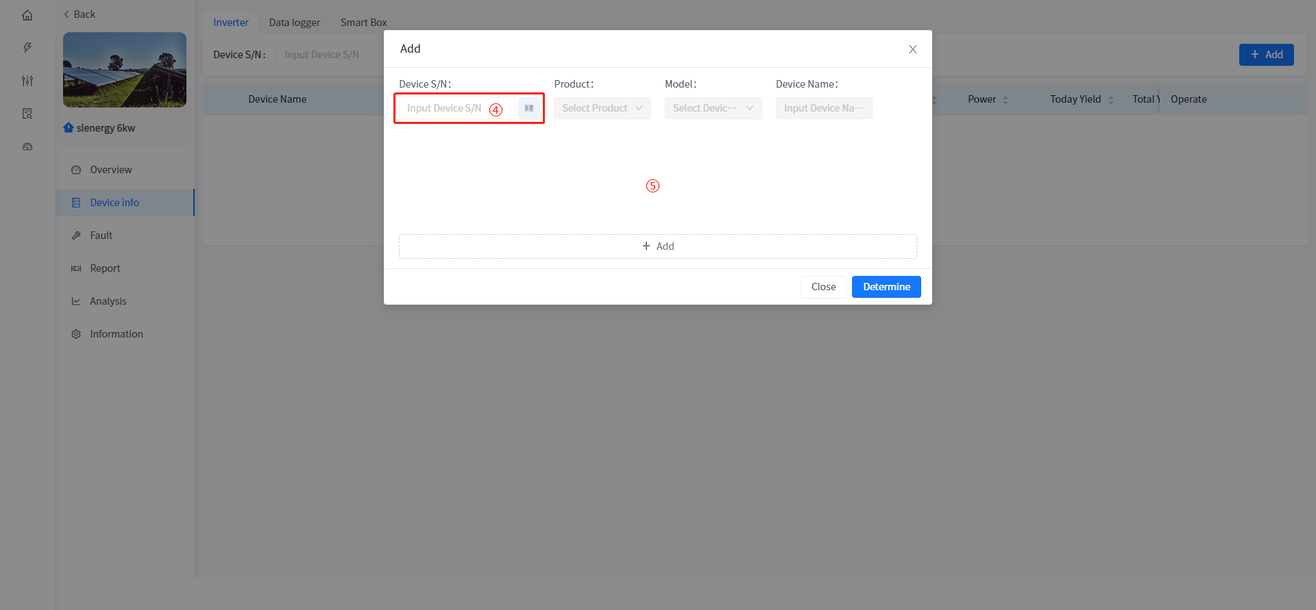 ⑤ Click any blank space in the box. (If the device data is already in the system, the product and model of the device will be automatically brought out at this time; If the device is not in the device library, HWOO Energy will open the input field to allow you to select the product and model of the device).