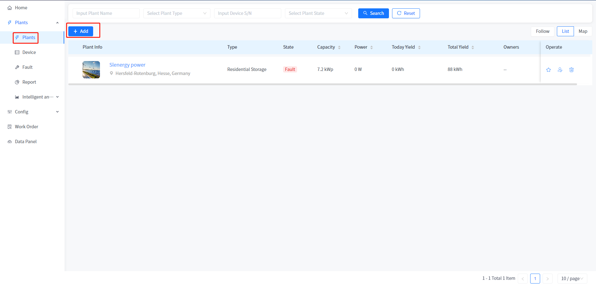 Dealer users click the [Add] button in the upper left corner of the Plant list to enter the information entry page. After filling in the information that meets the rules on the information entry page, they click [Create Now]. After a successful prompt, the plant is created.