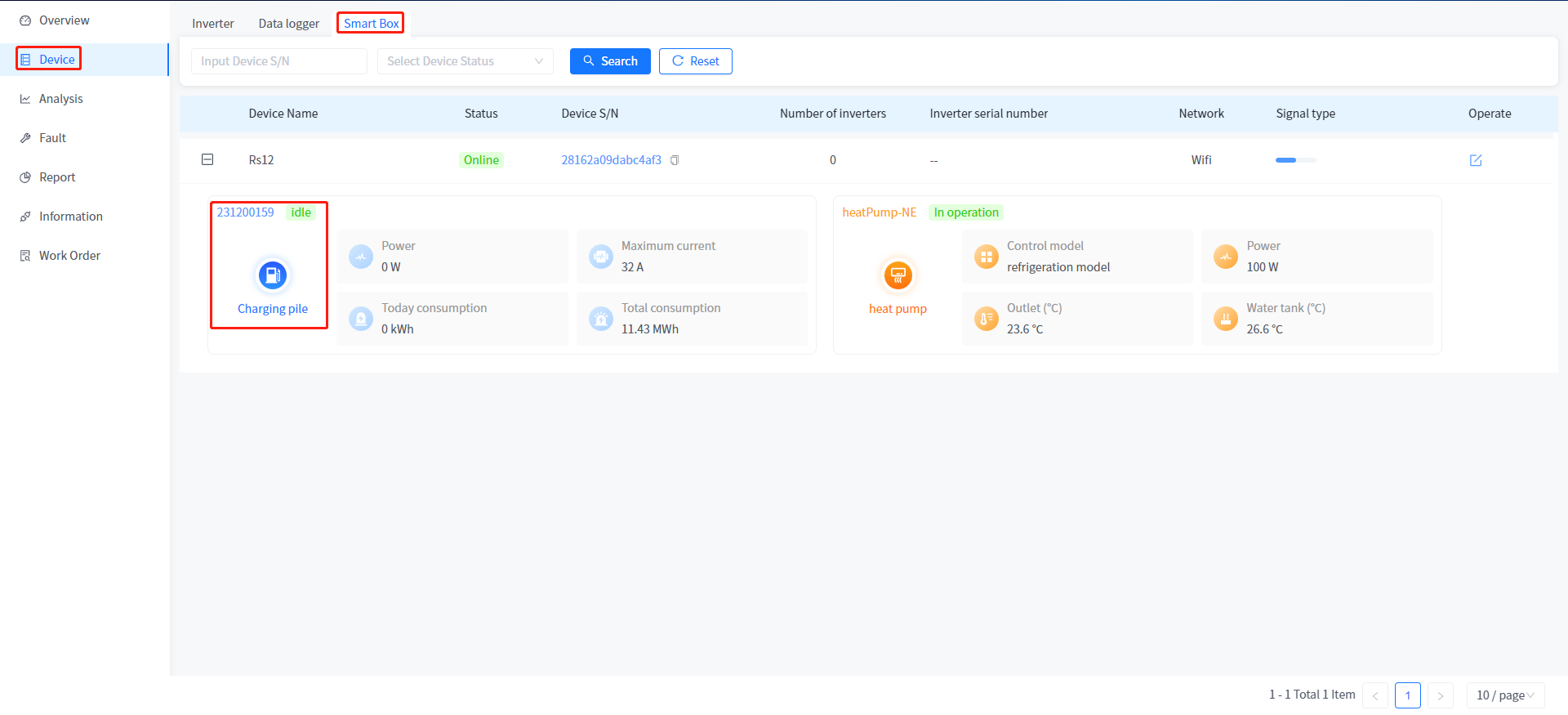This system supports the addition and association of plants to Smart Box devices, as well as data viewing and parameter configuration of associated heat pump and charging station devices under Smart Box.