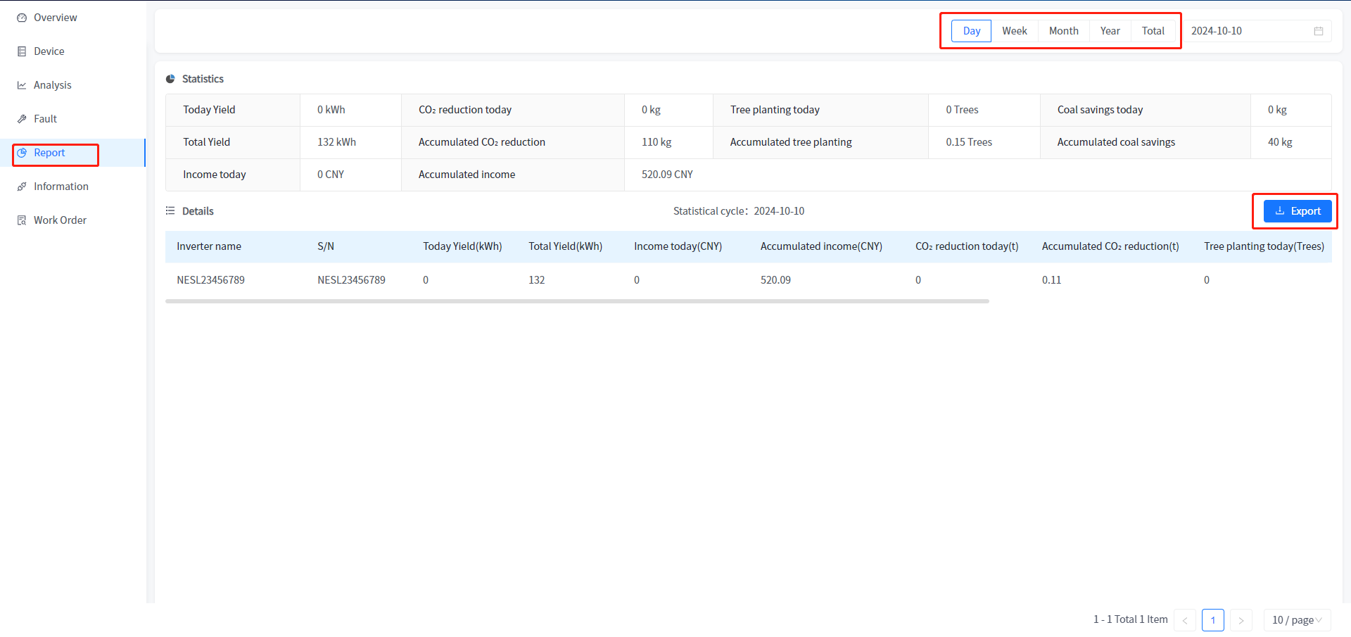 You can view the working data statistics of all equipment in the Plant under your name, and conduct statistics based on the equipment dimension. Support exporting data in file format. Click the [Export Data] button to export all Plant data. You can also click the [Day], [Week], [Month], [Year], [Cumulative] buttons in the upper right corner to query historical statistical data.