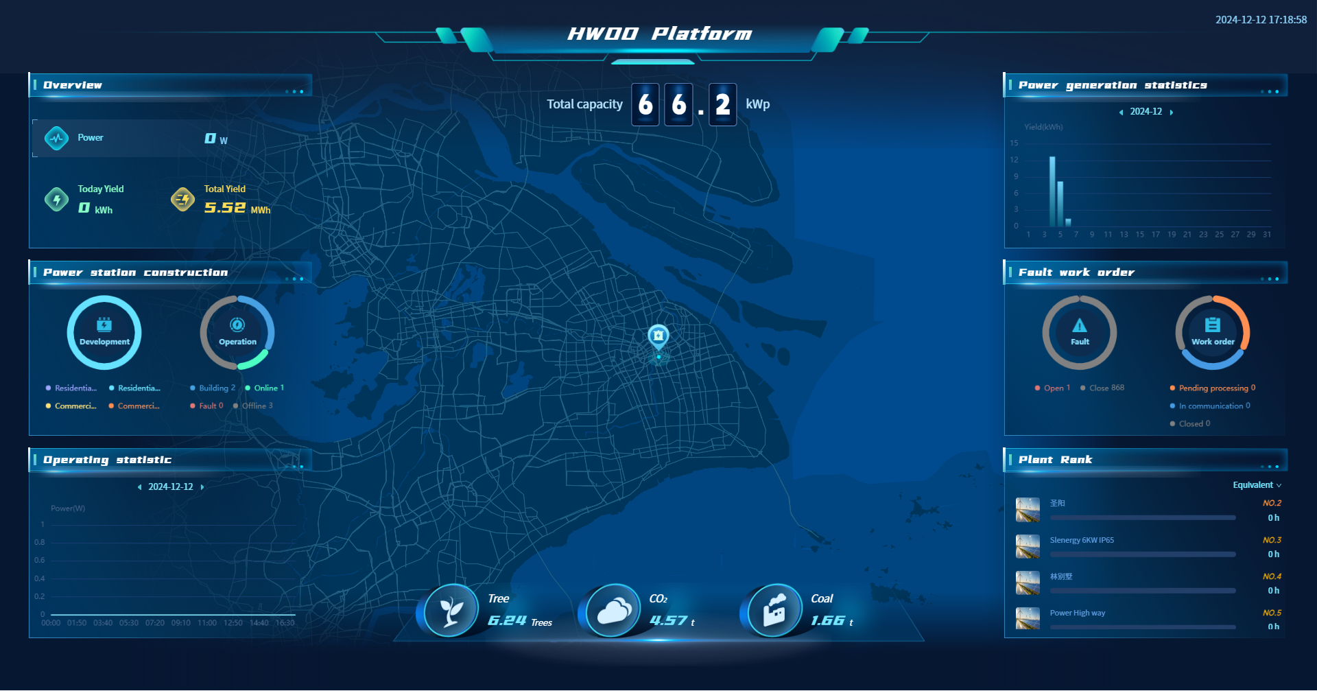 HWOO Energy提供了一款集电站监控、能源管理和数据分析于一体的智能大屏,实时呈现电站运营的全方位信息,帮助您更好地掌控能源管理。通过丰富的数据展示和分析功能,您能深入了解电站的运行效率、发电效益和节能减排效果,同时监控全球电站和故障的状态情况。