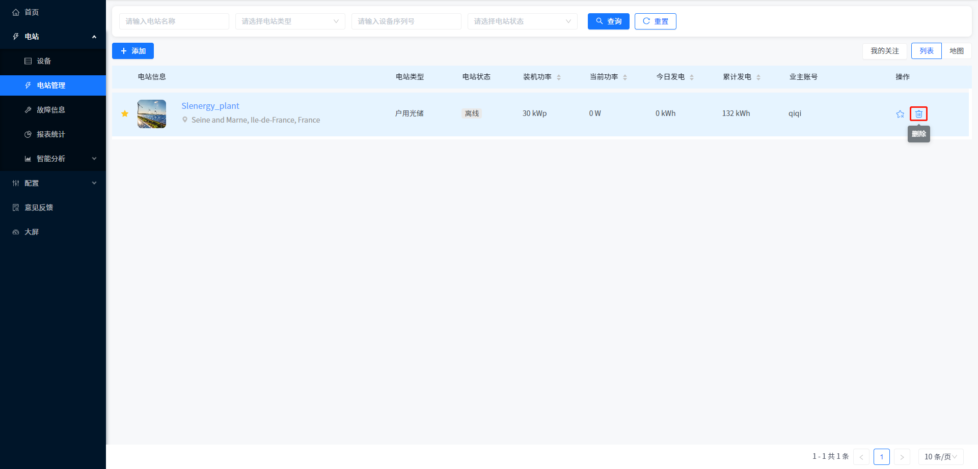 您可以对您的电站进行删除操作,删除成功后会自动解绑关联该电站的设备;自动取消授权拥有该电站权限的用户;业主账户自动与该电站进行解绑。