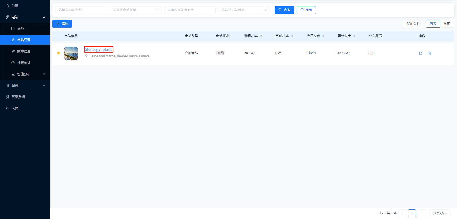 本系统支持查看电站相关的所有信息数据,您可以在电站列表页面,点击电站名称进入电站详情的电站概览页面。