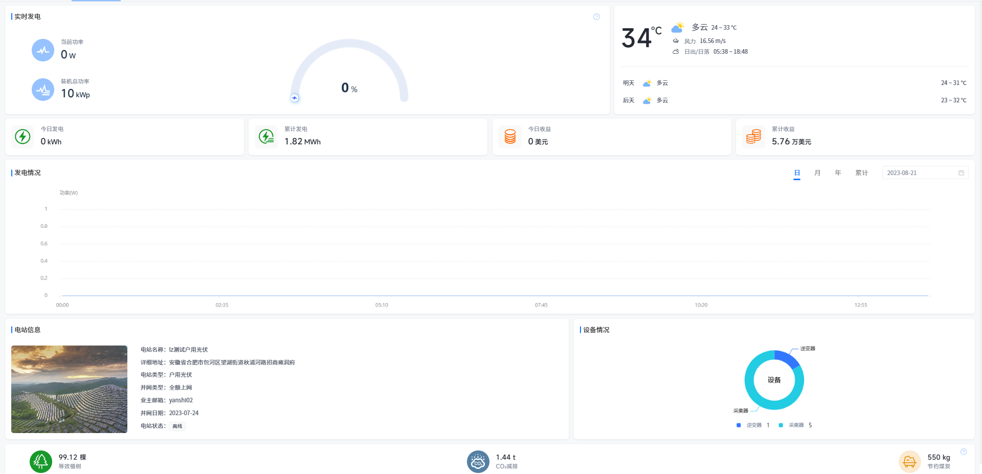 [光伏发电]展示您所选电站光伏发电实时功率和发电量统计情况。