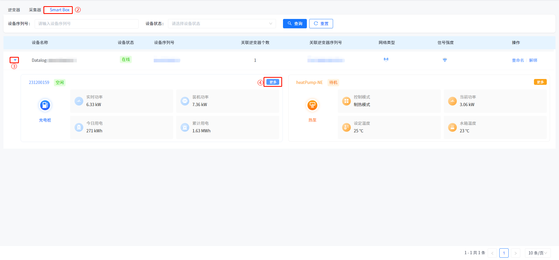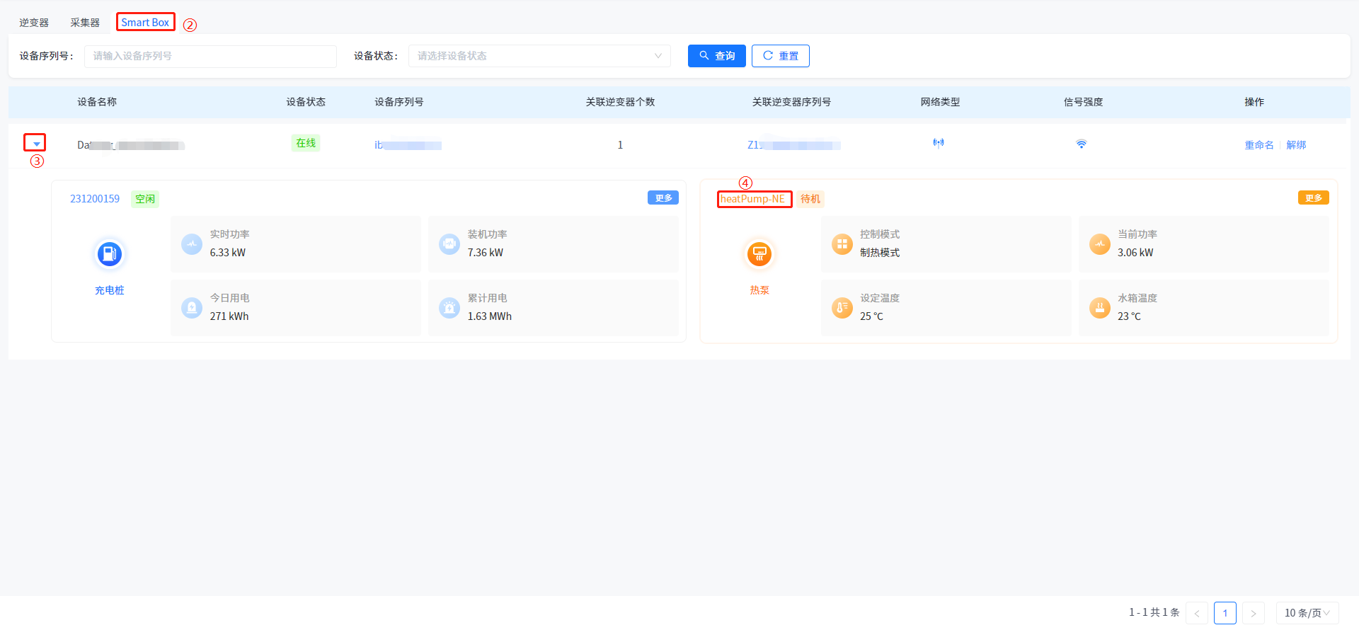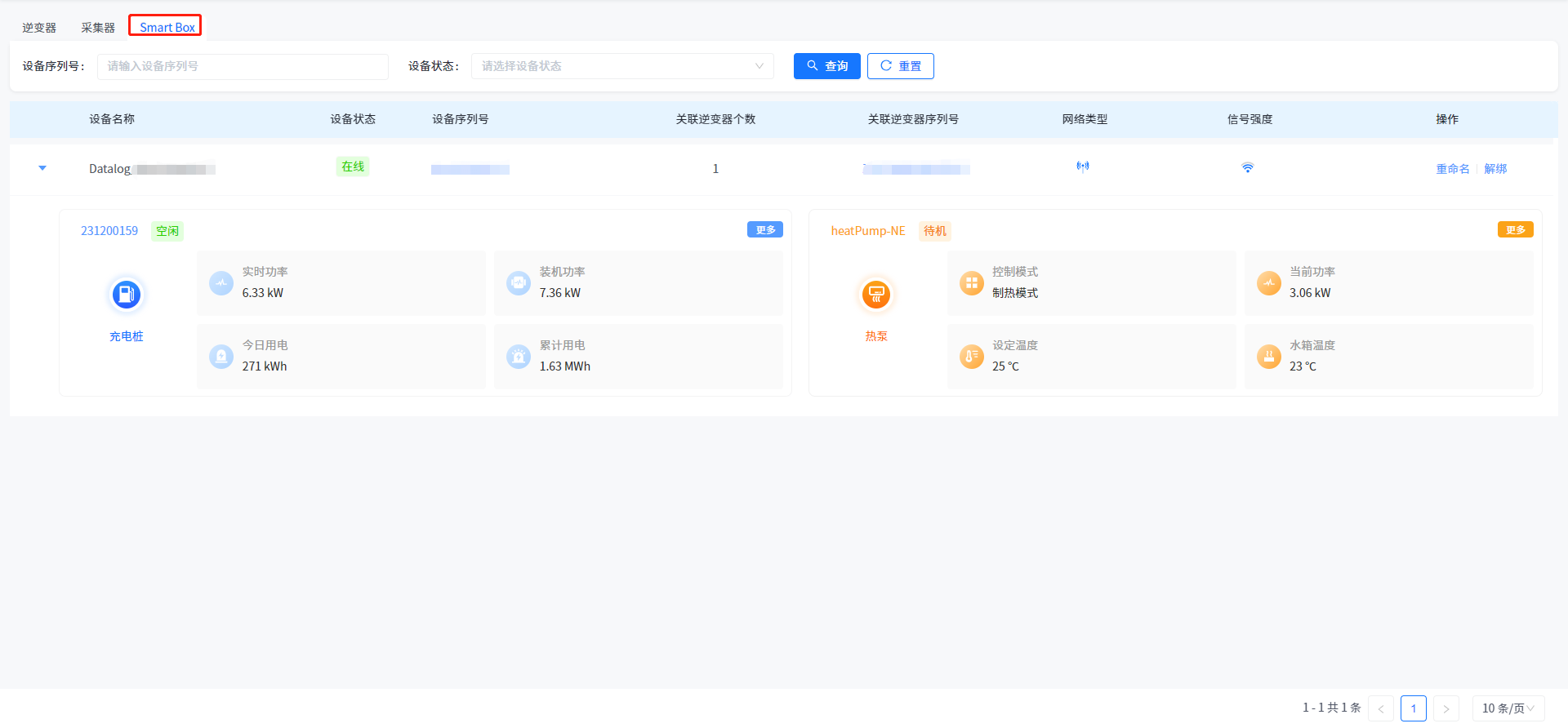 本系统支持您对Smart Box设备进行新增和关联电站的操作,也可以对Smart Box下关联的热泵和充电桩设备进行数据查看、参数配置的操作。