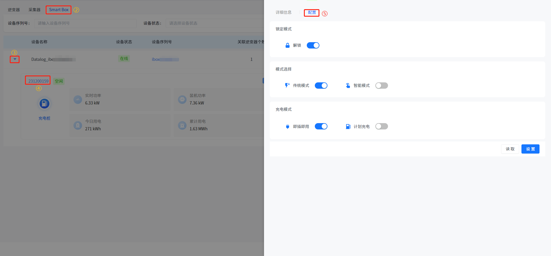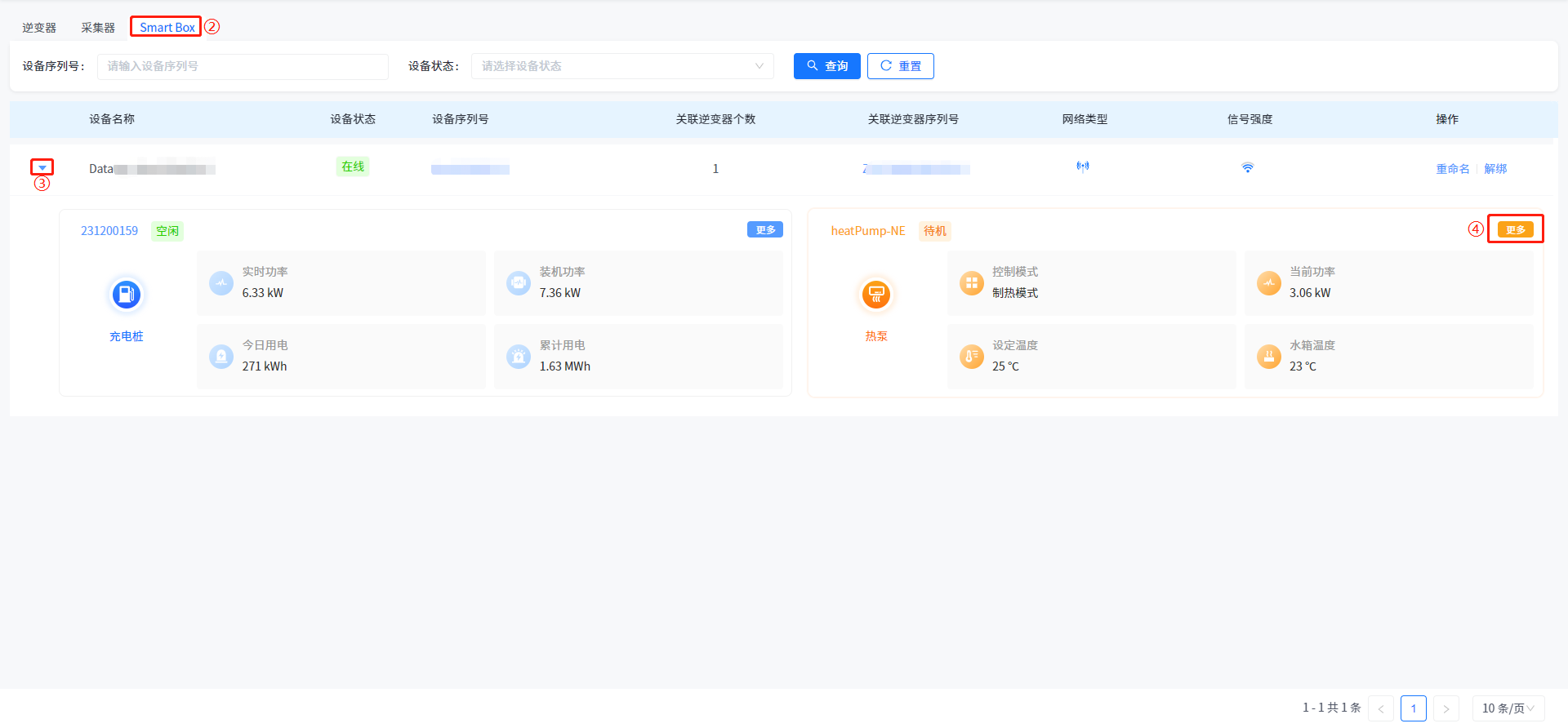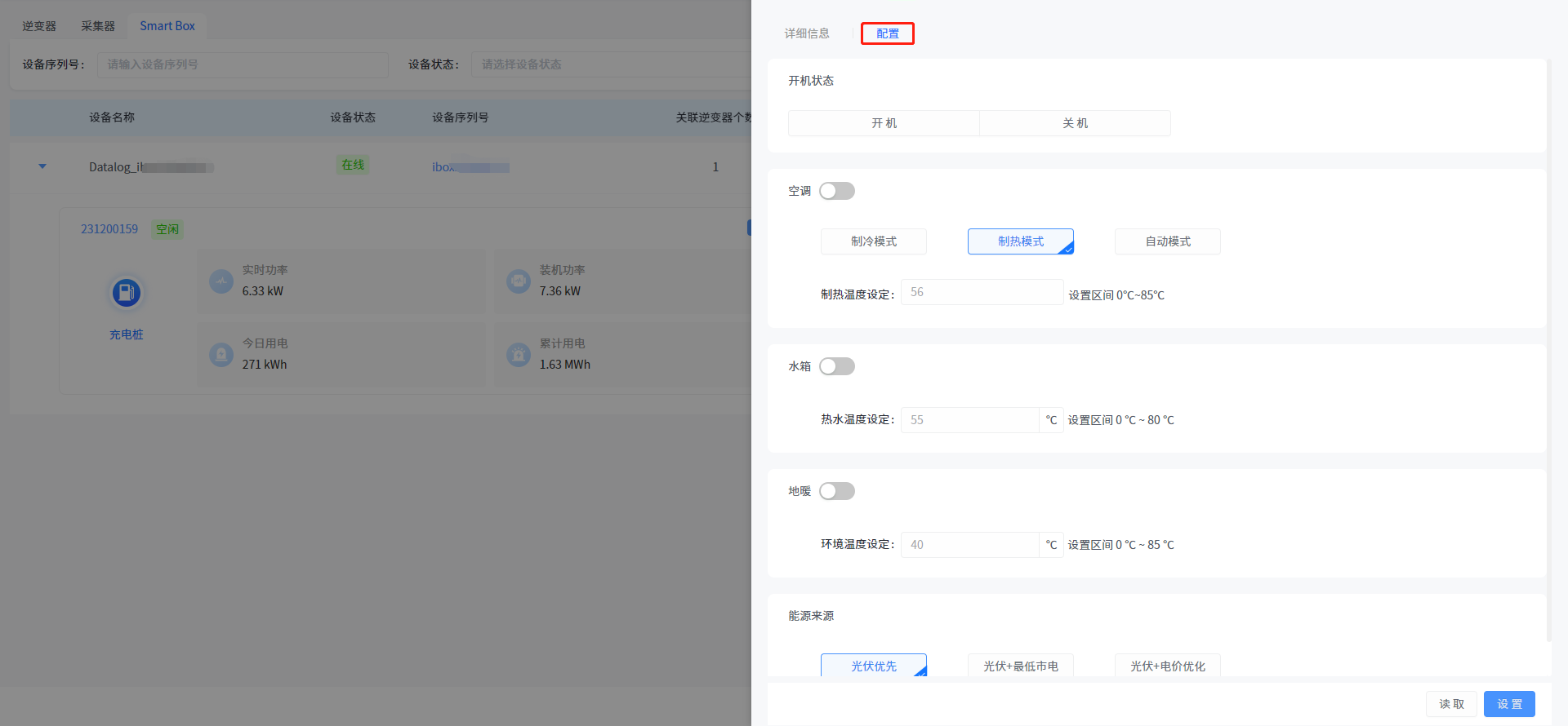 本系统支持您对Smart Box设备进行新增和关联电站的操作,也可以对Smart Box下关联的热泵和充电桩设备进行数据查看、参数配置的操作。