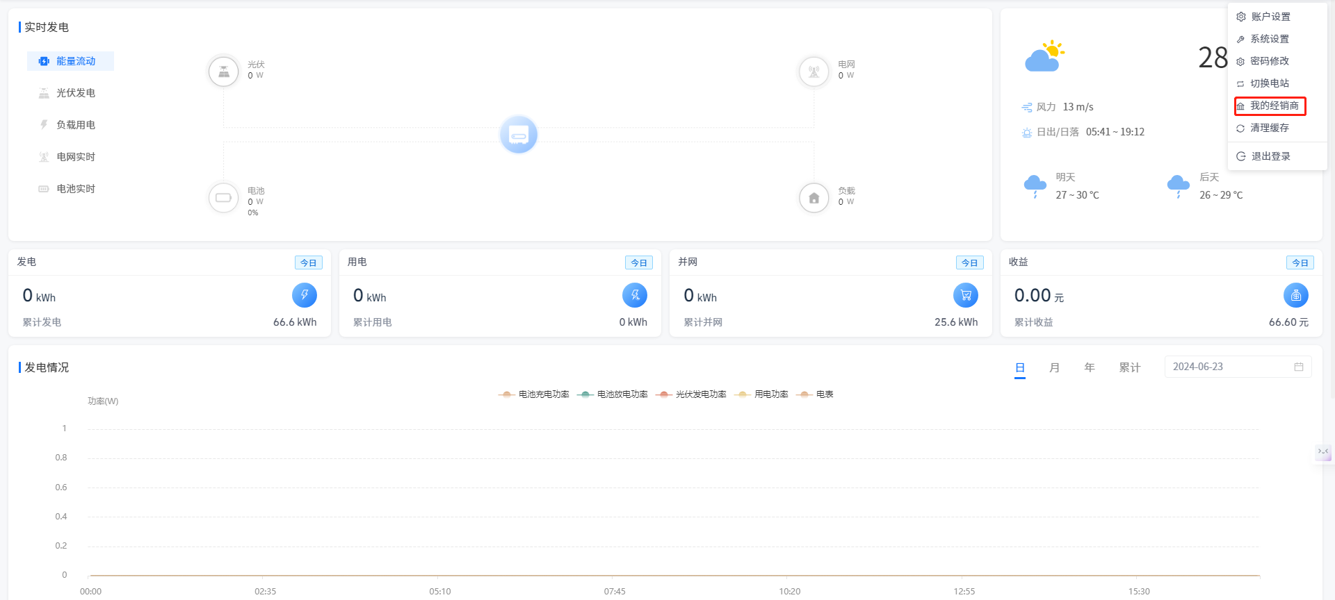 本系统支持业主在我的经销商弹窗内查看电站经销商的联系方式,通过点击右上角欢迎语处的[我的经销商]按钮打开弹窗。